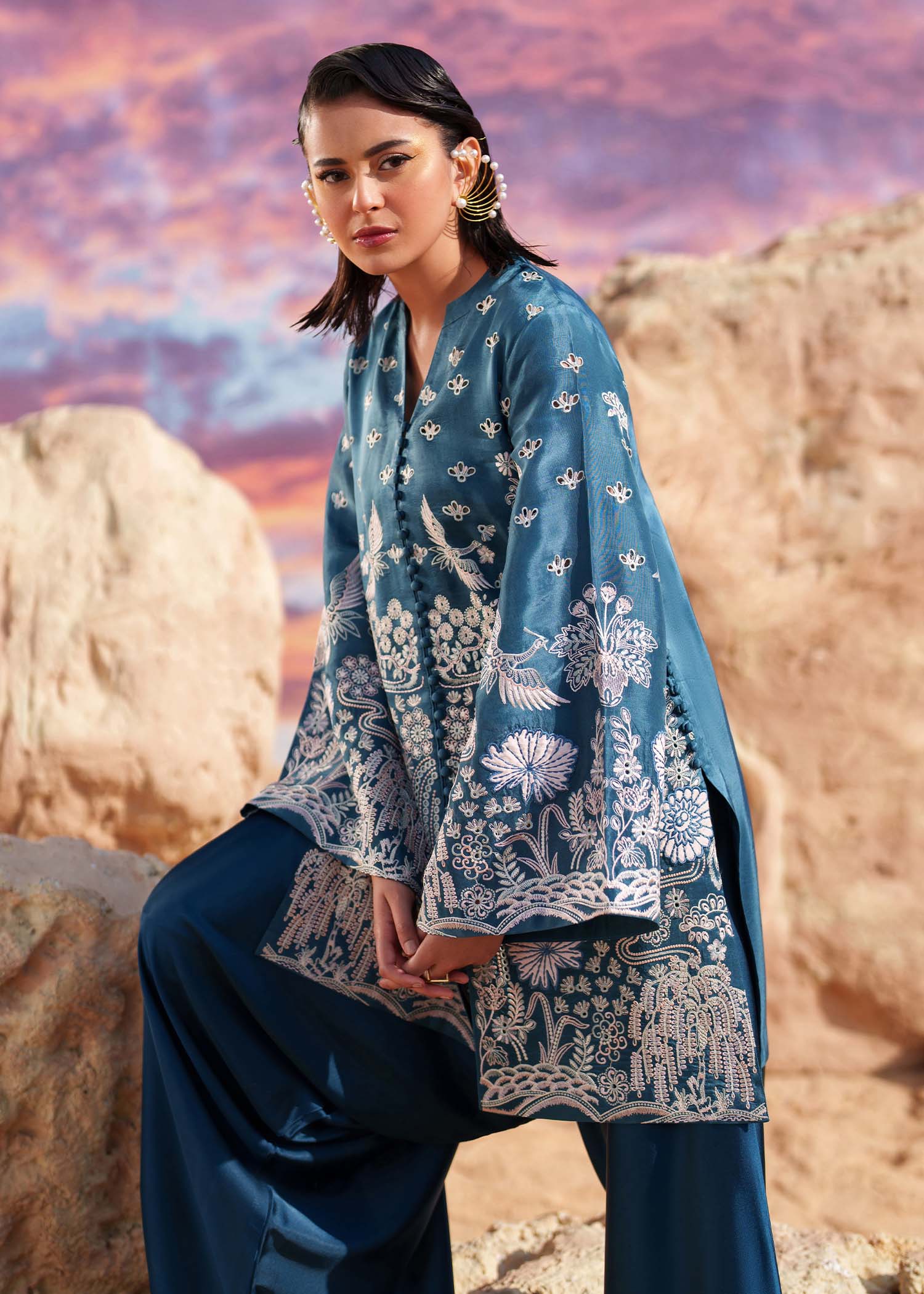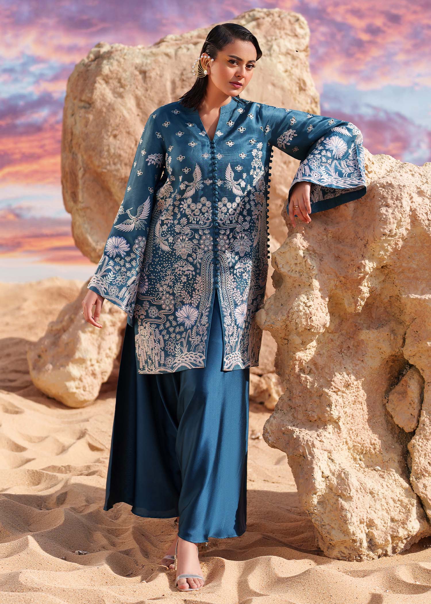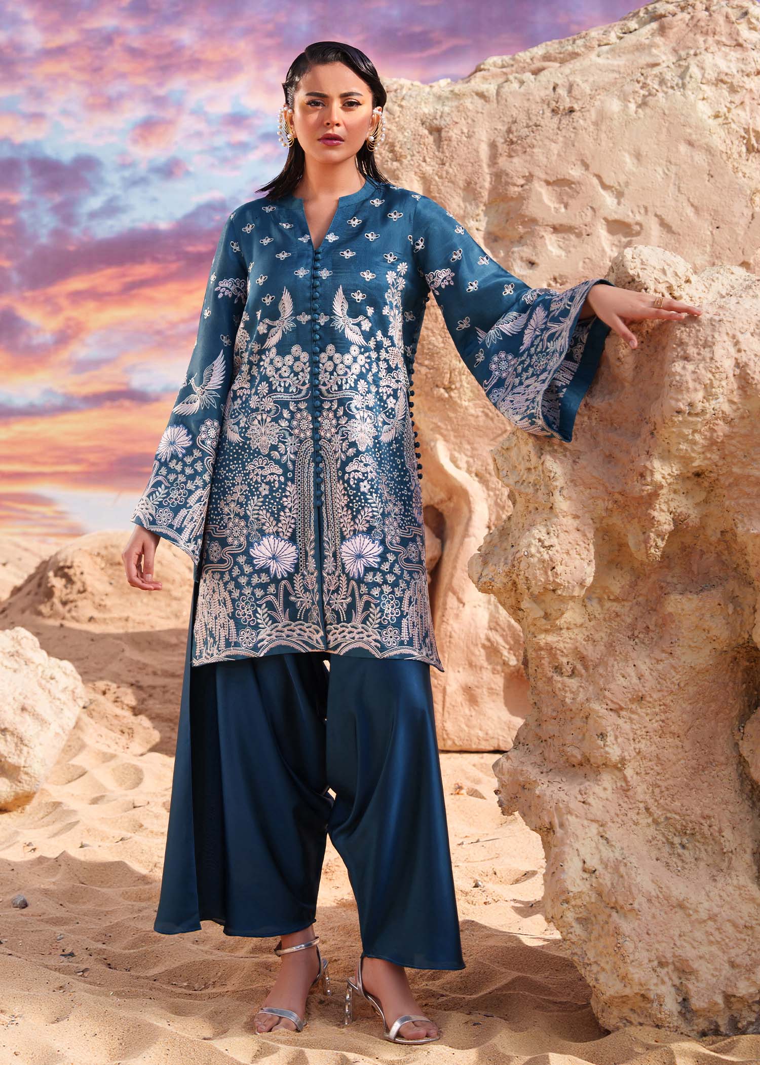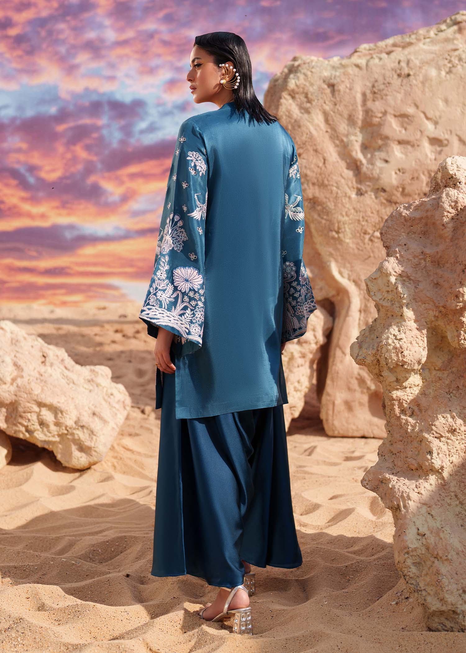 The shirt, crafted from premium Tussel Silk fabric, is resplendent with intricate floral embroidery that runs elegantly along the front panel, neckline, and flowing bell sleeves. Its further enhanced with Applique motifs. This delicate threadwork creates a captivating contrast against the deep Navy Blue base. Paired with perfectly tailored, matching culottes, this ensemble offers breathable comfort and enduring elegance.