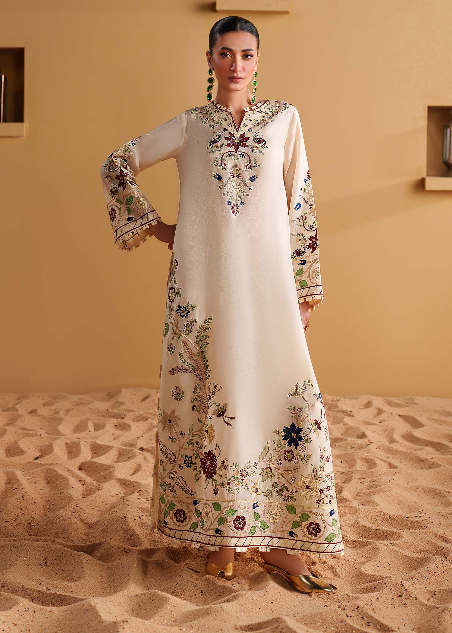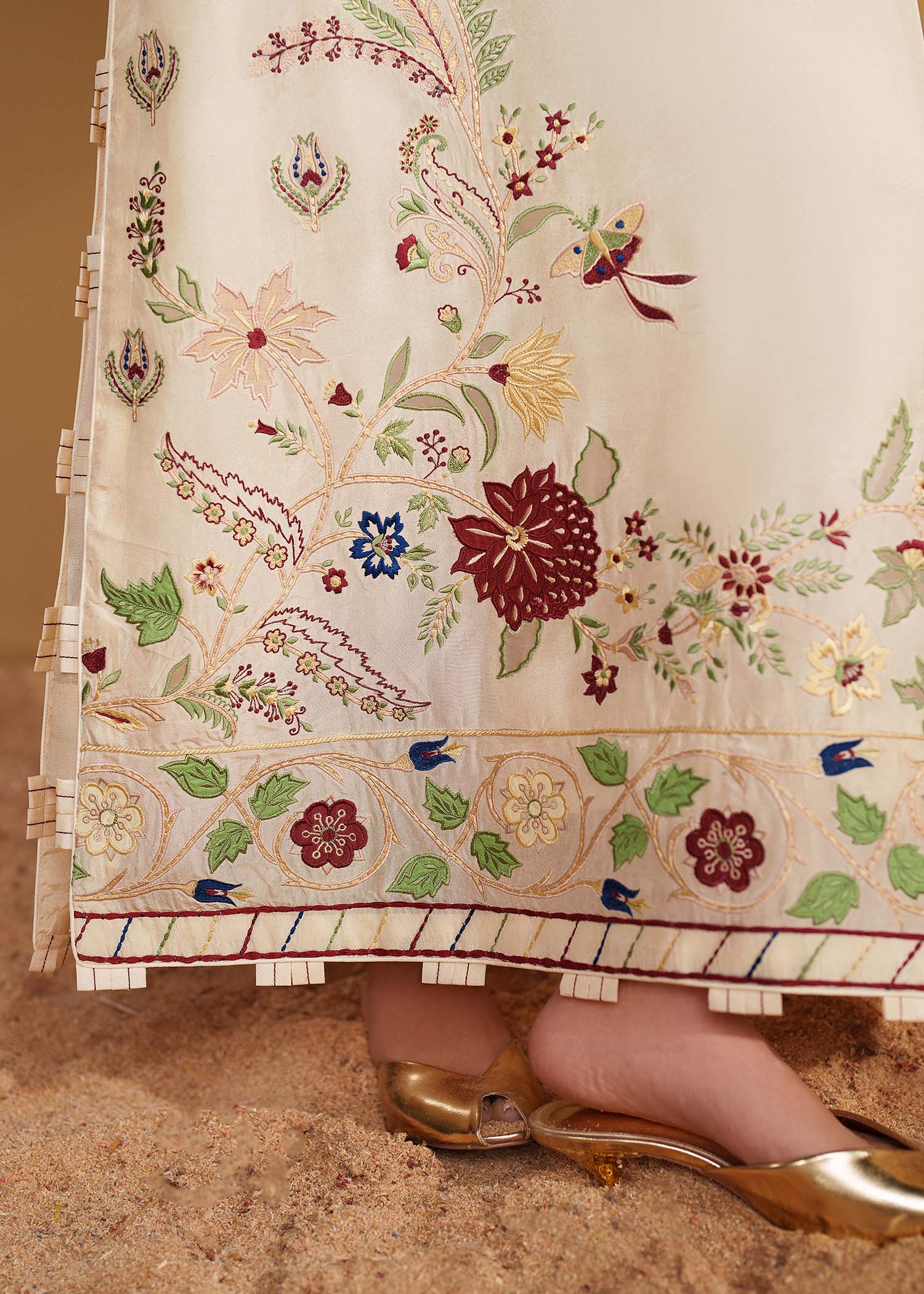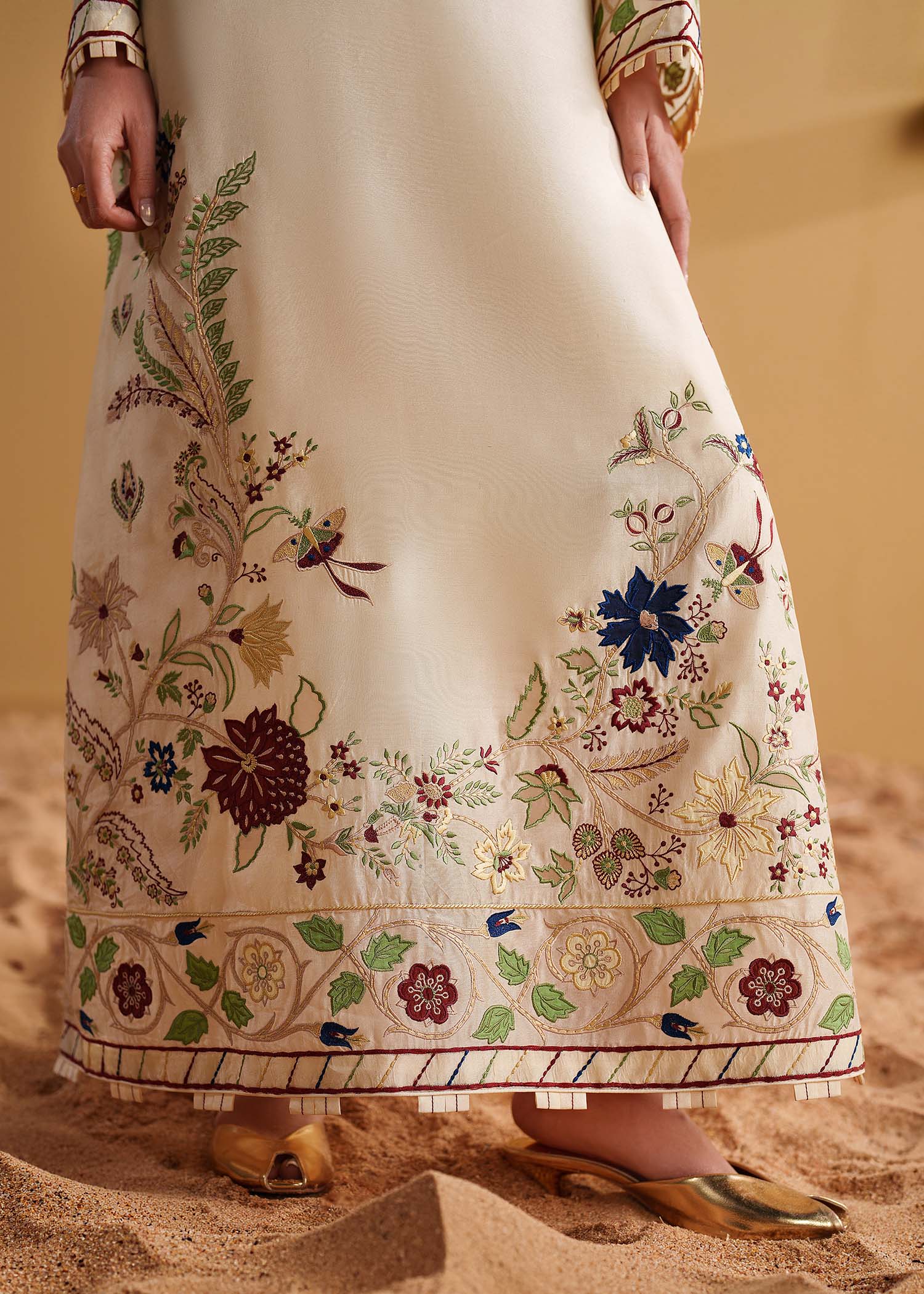 Make a bold statement in our Ivory embroidered kaftan. It is meticulously crafted from luxurious tussel silk adorned with handcrafted accents, applique work and multicolored embroidery, inspired from a botanical garden. This one of a kind piece is a beautiful choice for an evening out.