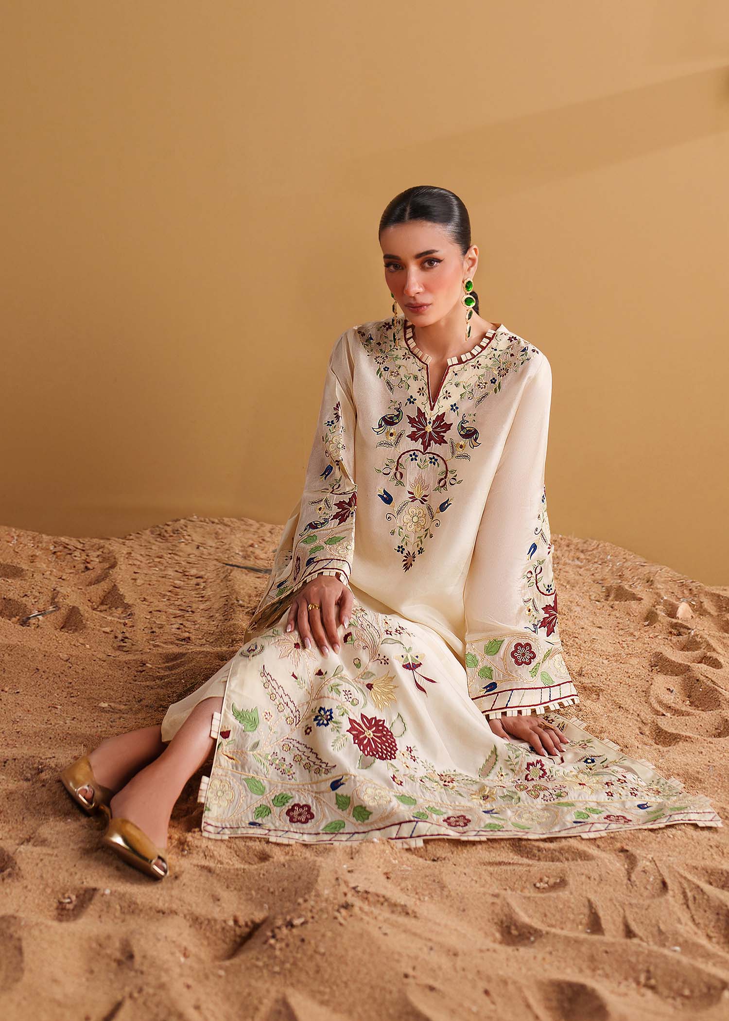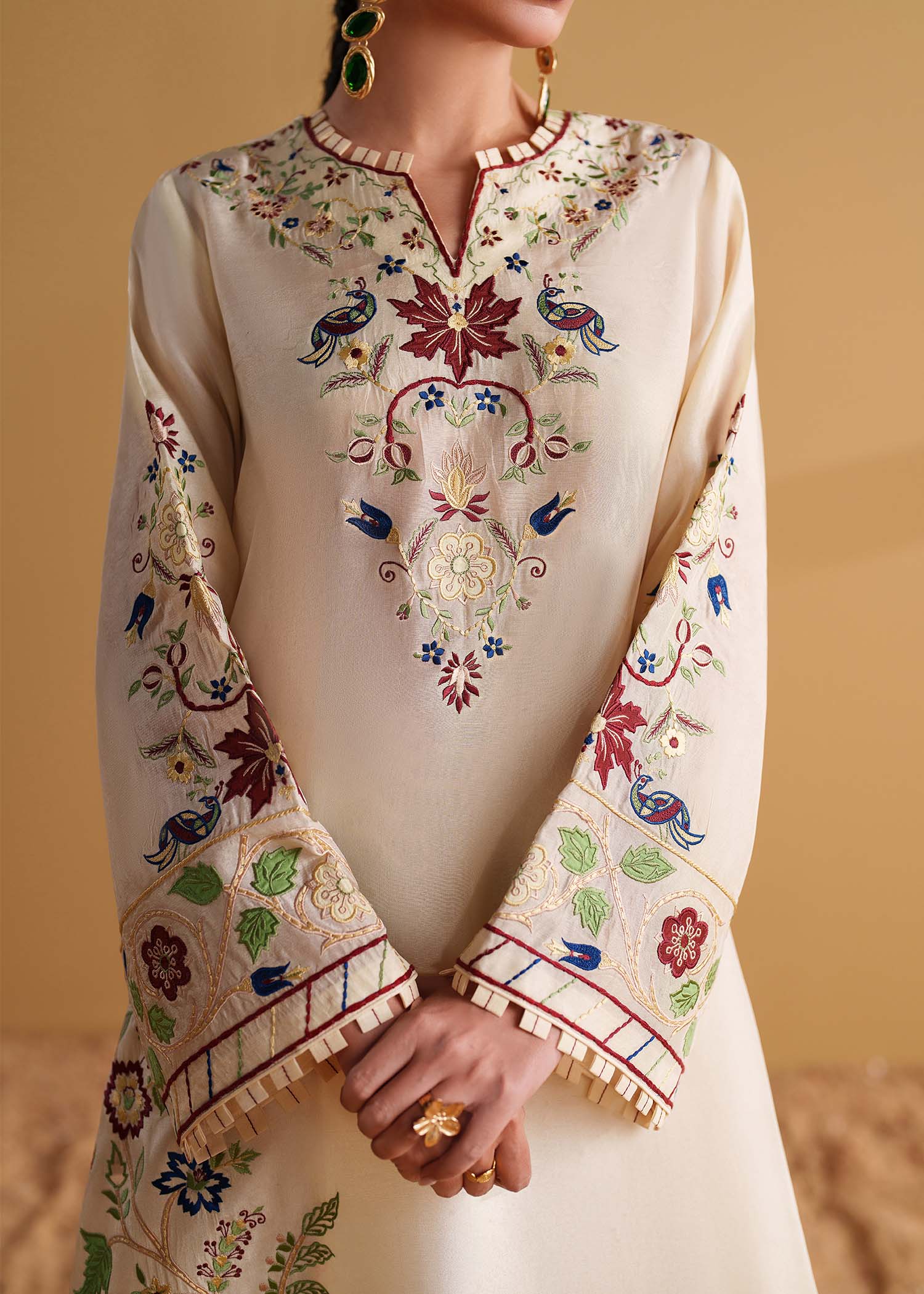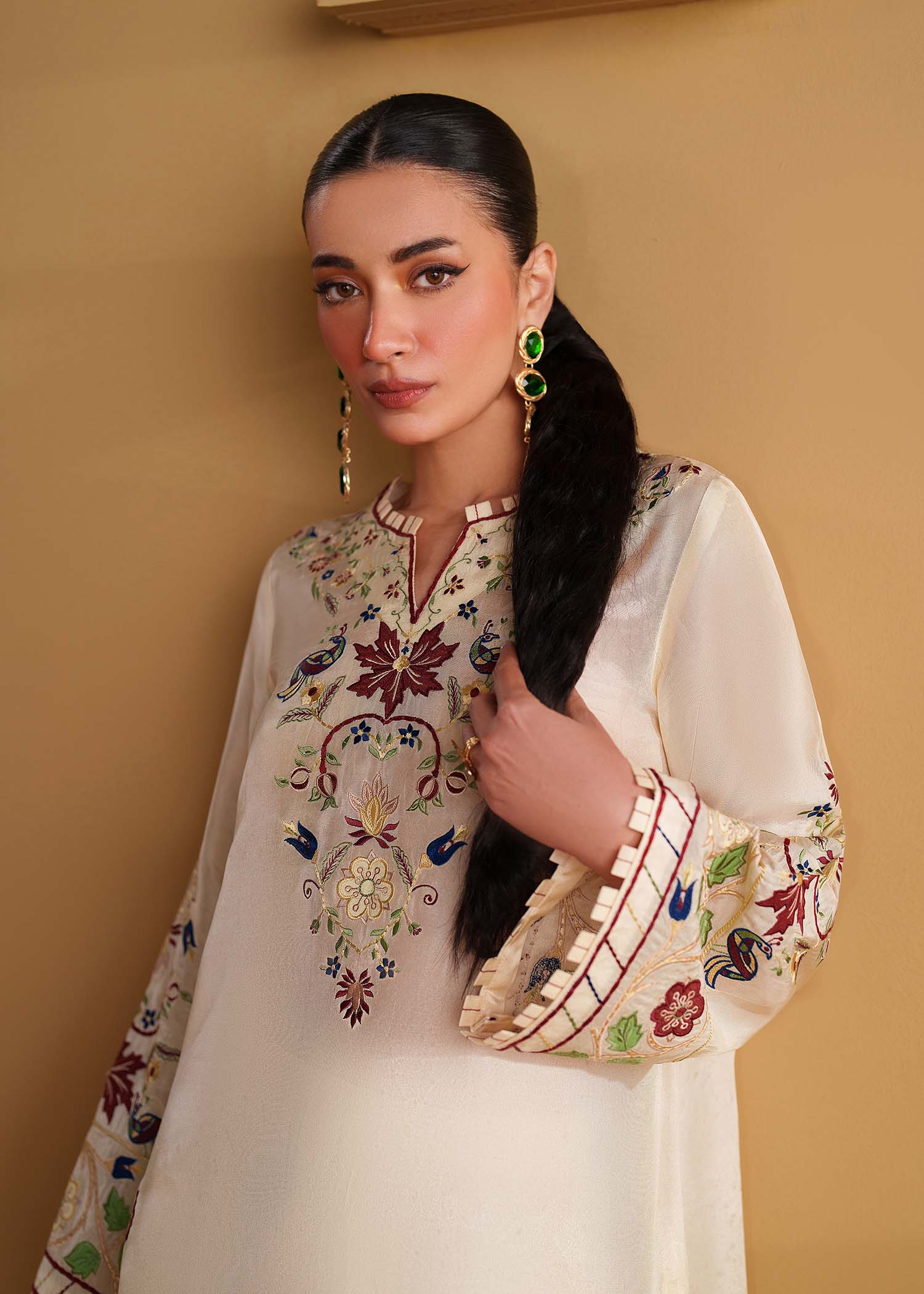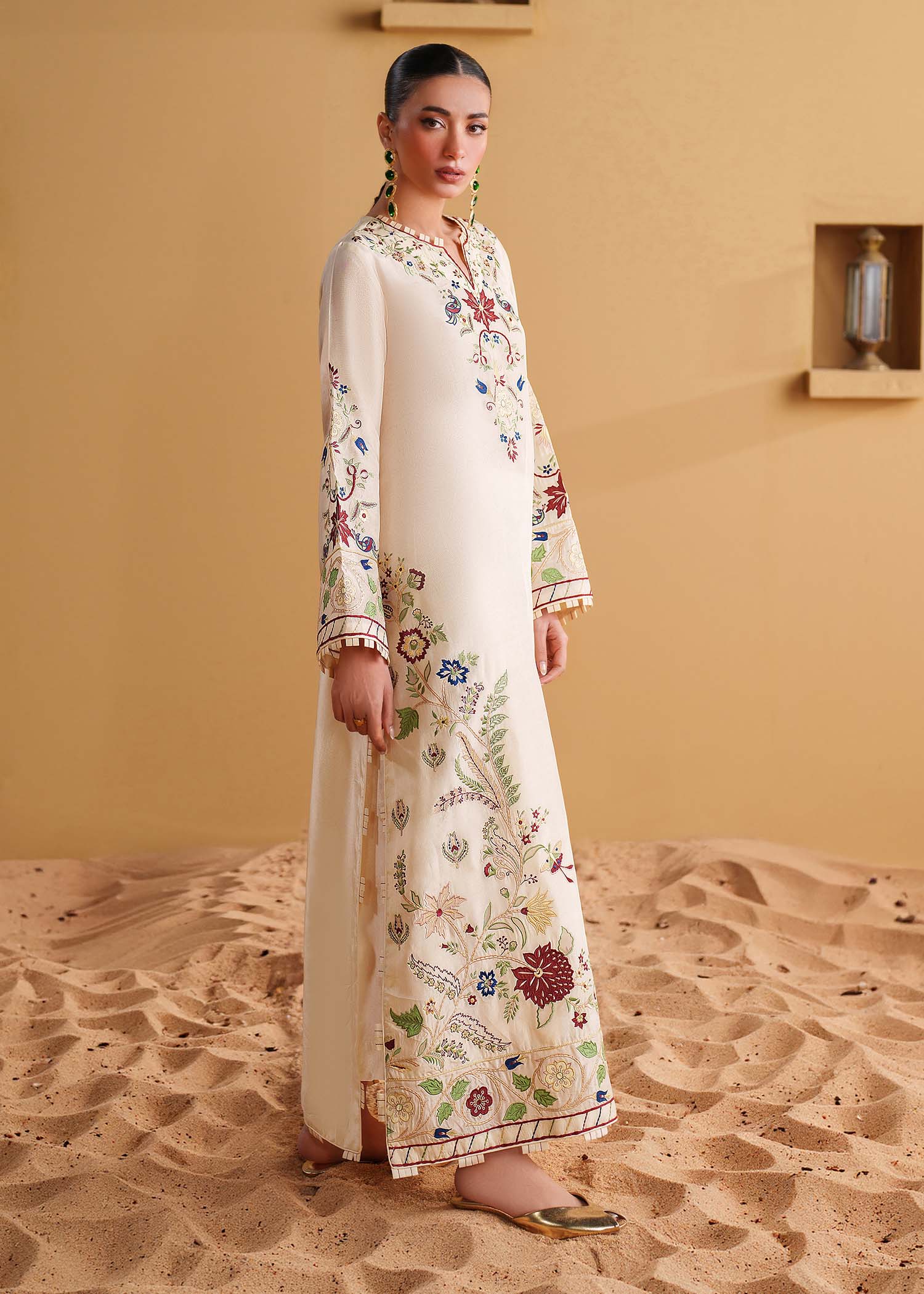 Make a bold statement in our Ivory embroidered kaftan. It is meticulously crafted from luxurious tussel silk adorned with handcrafted accents, applique work and multicolored embroidery, inspired from a botanical garden. This one of a kind piece is a beautiful choice for an evening out.