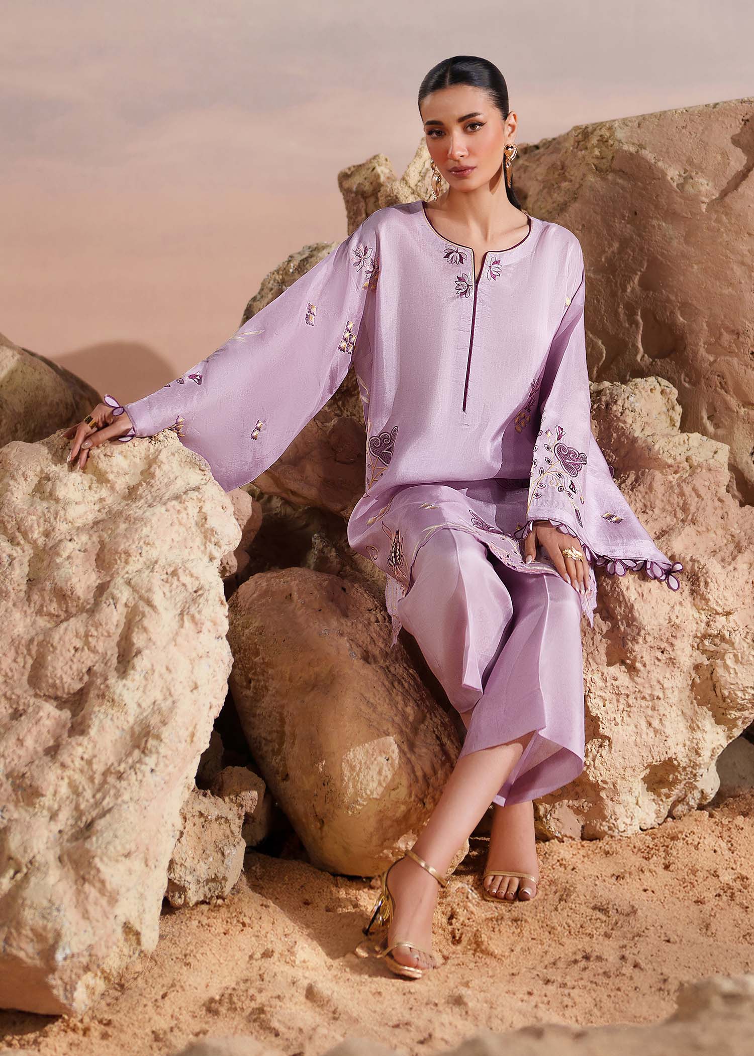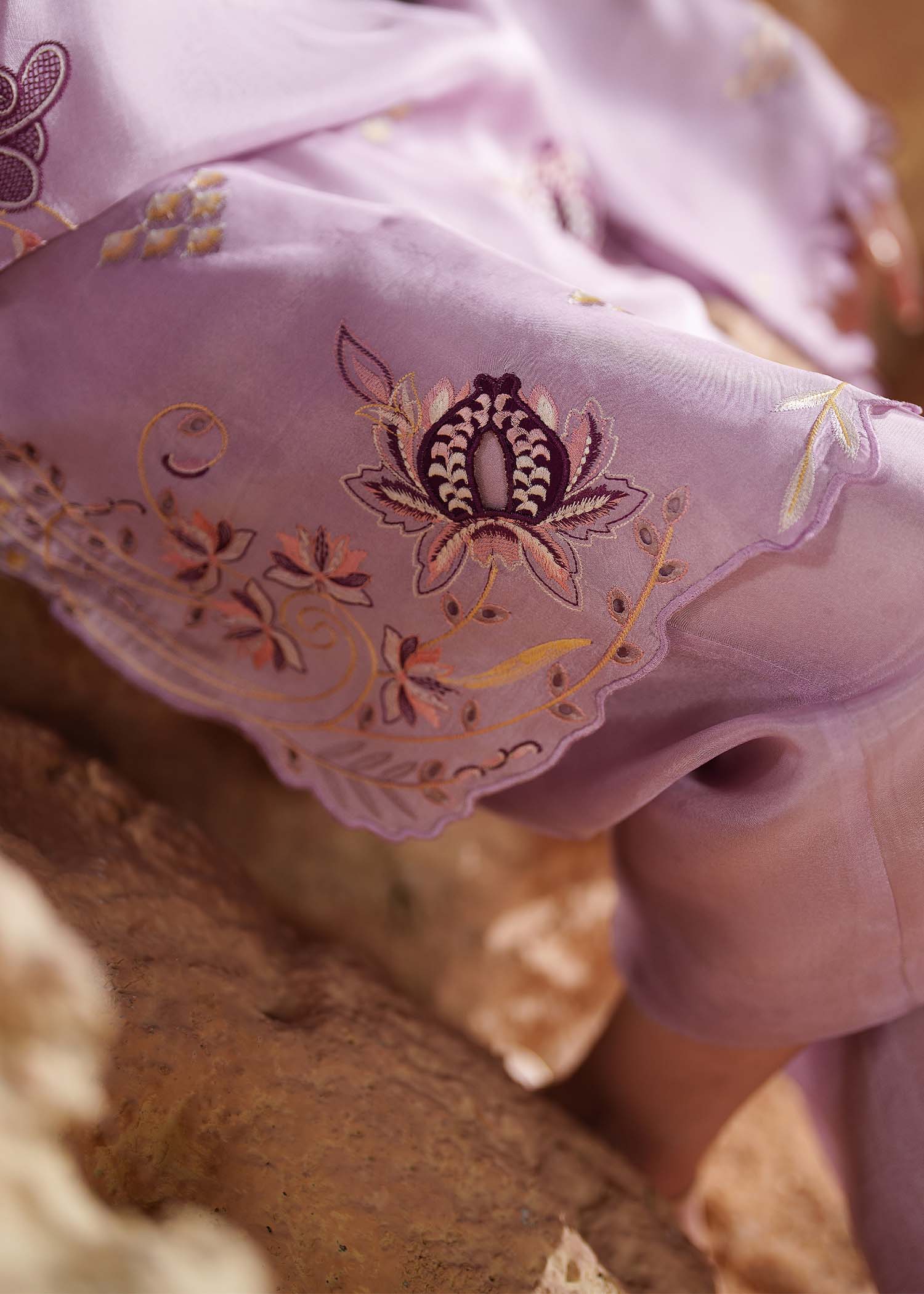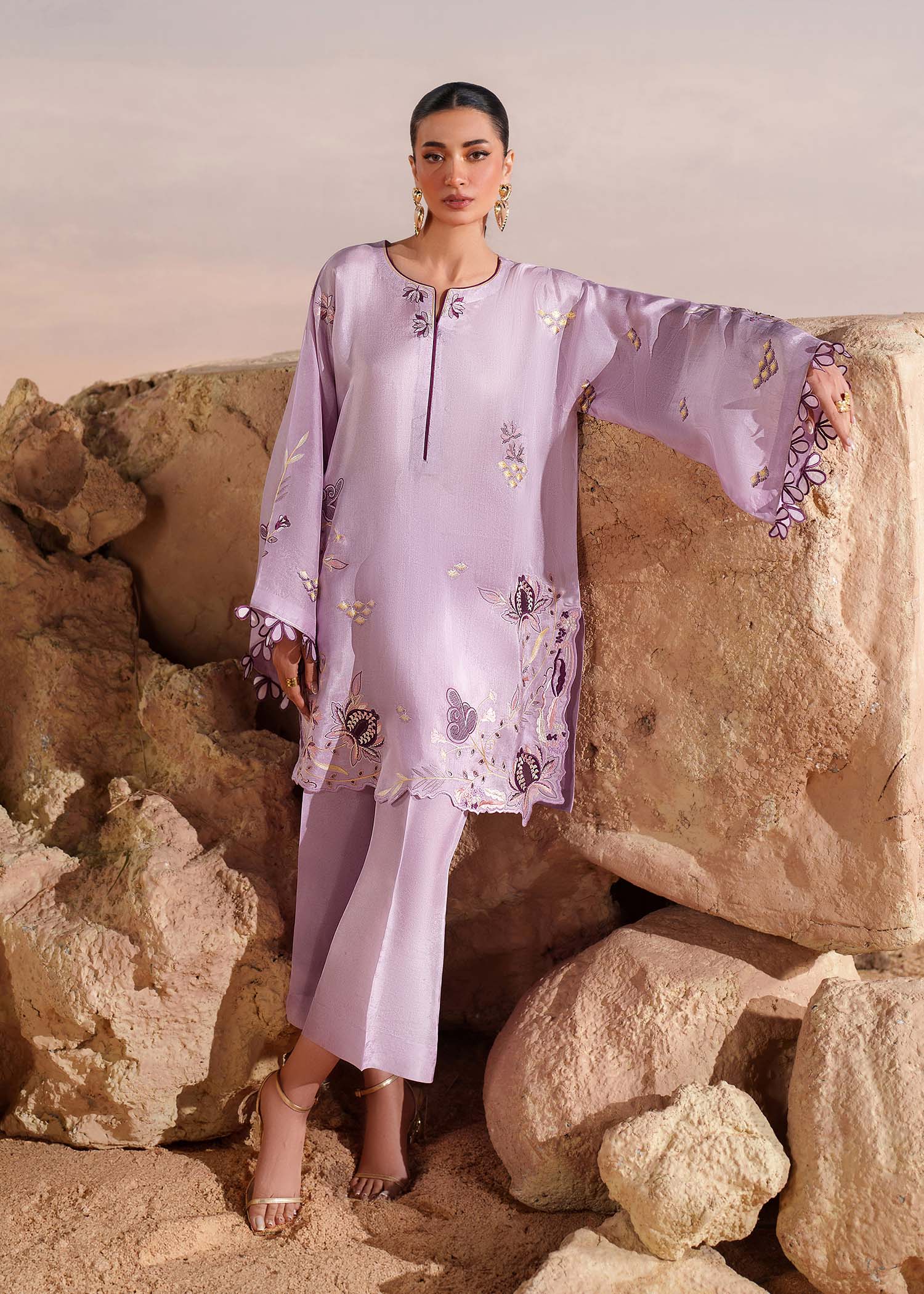 A splendid creation in Lavender, this tussel silk short shirt is adorned with botanical embroidery elevated with aaplique motifs. It has flared sleeves with 3D flowers on the border that add a delicate flourish, complemented by a cutwork hemline. It's paired with tussel silk straight pants.