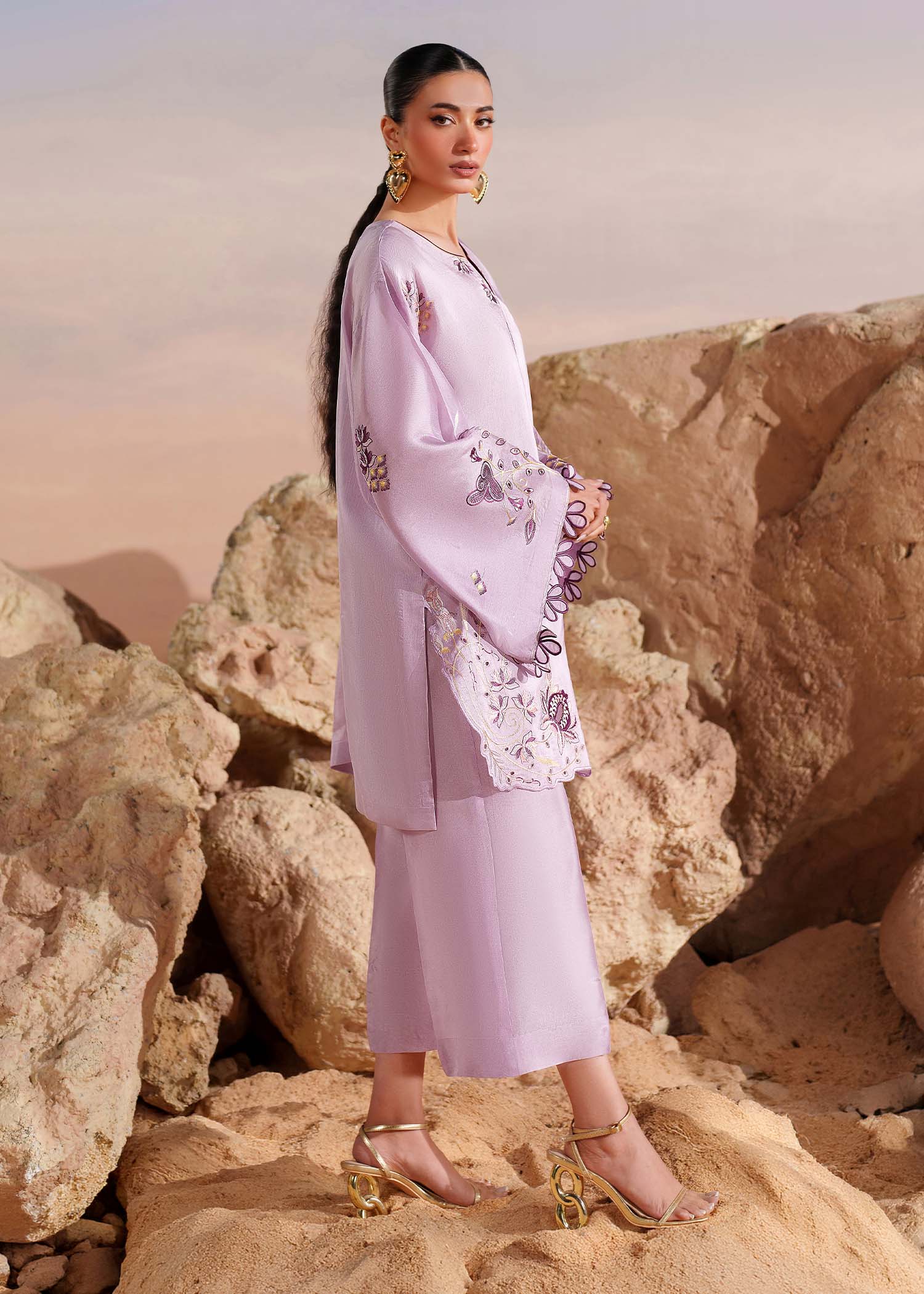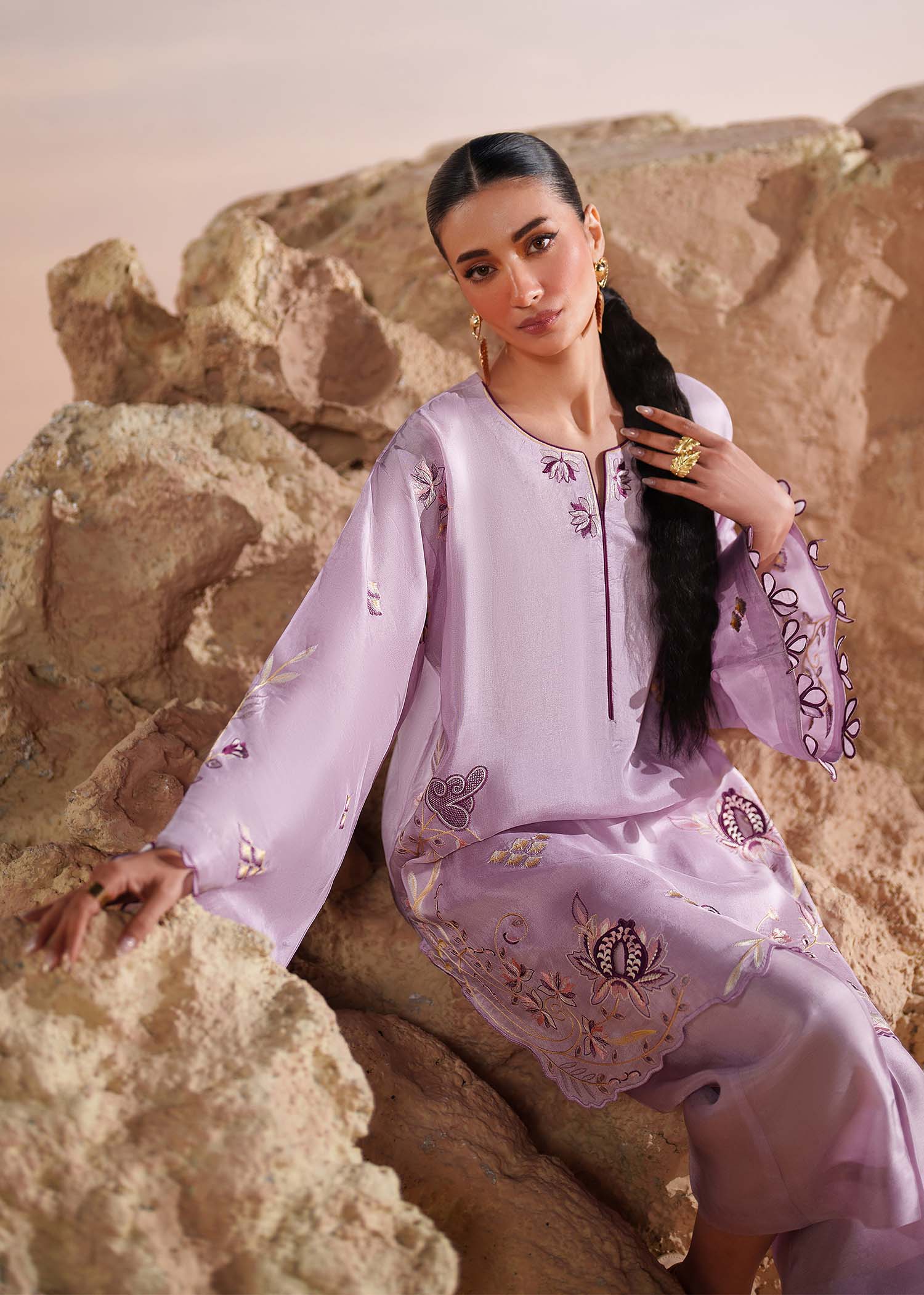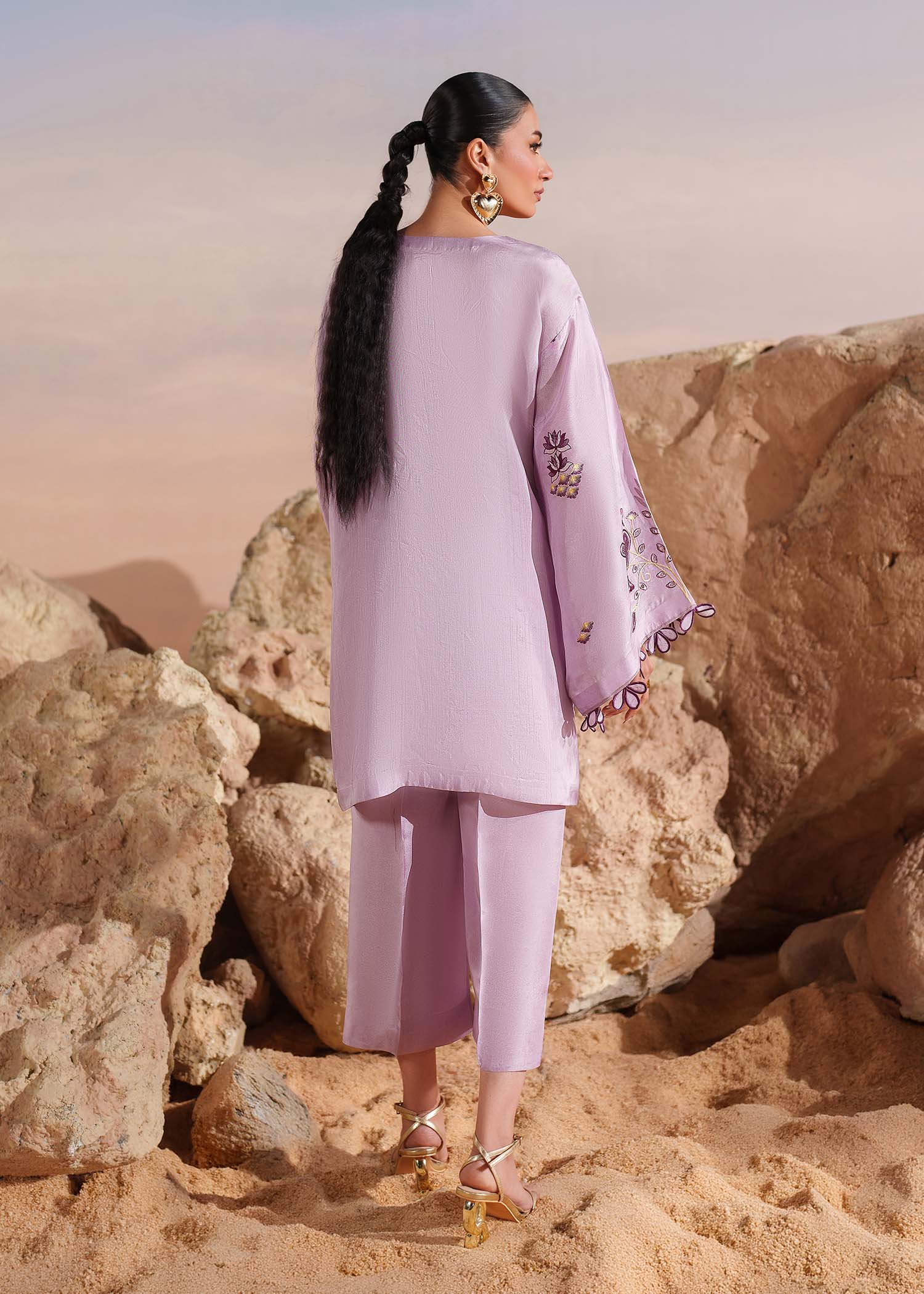 A splendid creation in Lavender, this tussel silk short shirt is adorned with botanical embroidery elevated with aaplique motifs. It has flared sleeves with 3D flowers on the border that add a delicate flourish, complemented by a cutwork hemline. It's paired with tussel silk straight pants.