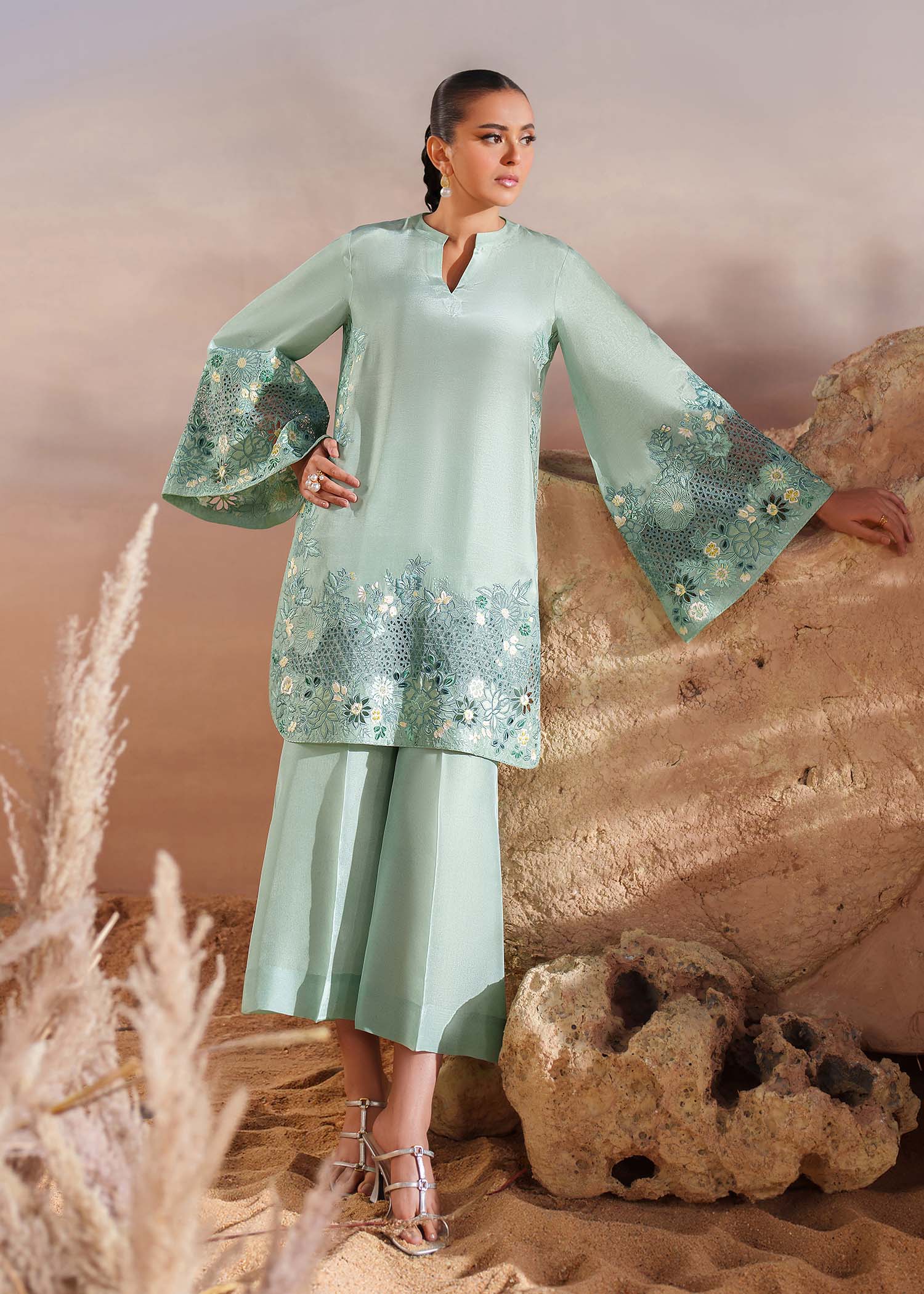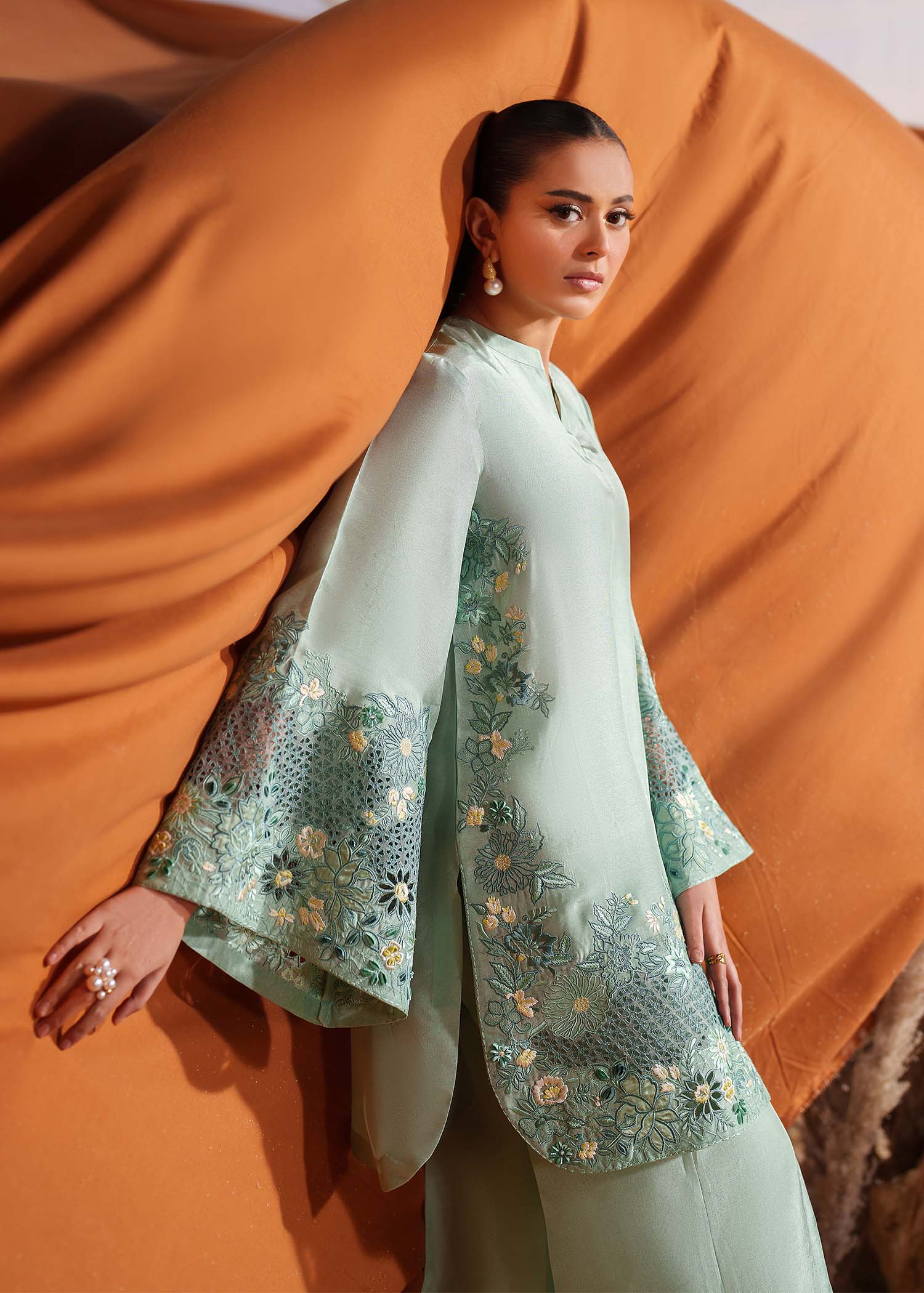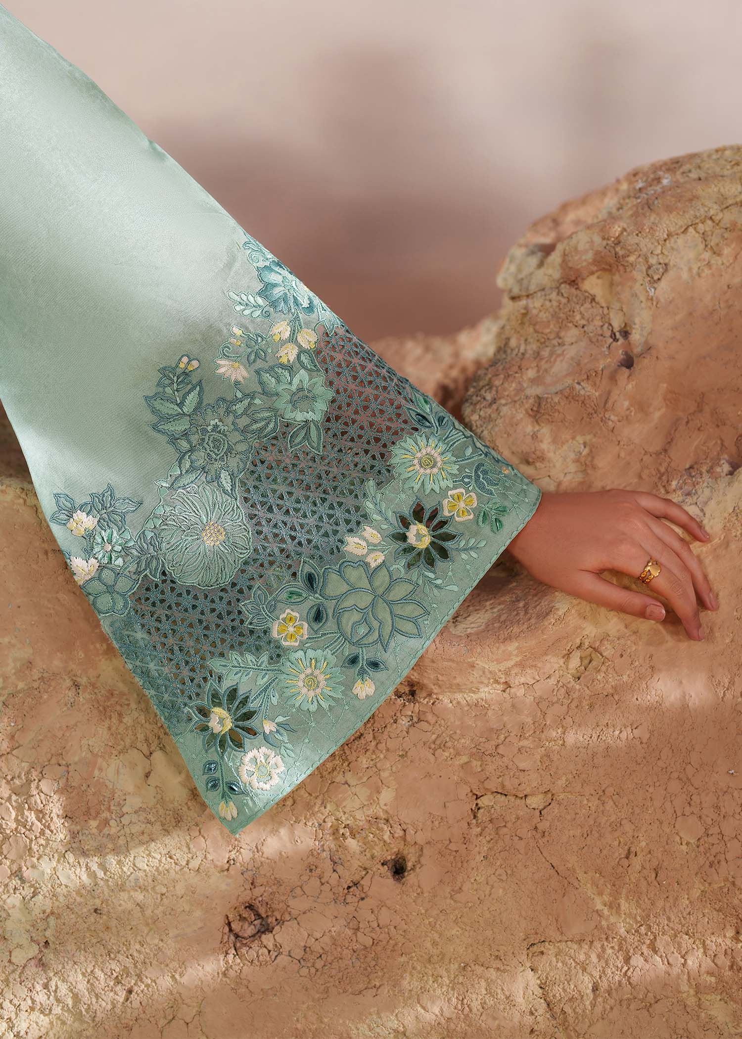 In Misty mint & Turquoise, this tussel silk shirt is cut in a relaxed silhouette, its surface traced with floral embroidery embroidery that elevate the front and sleeves with delicate artistry. The main highlight is the floral motifs that are appliqued on the shirt. Paired with straight pants and delicate 3D tassels, the ensemble carries the grace of sheer craft with effortless charm.