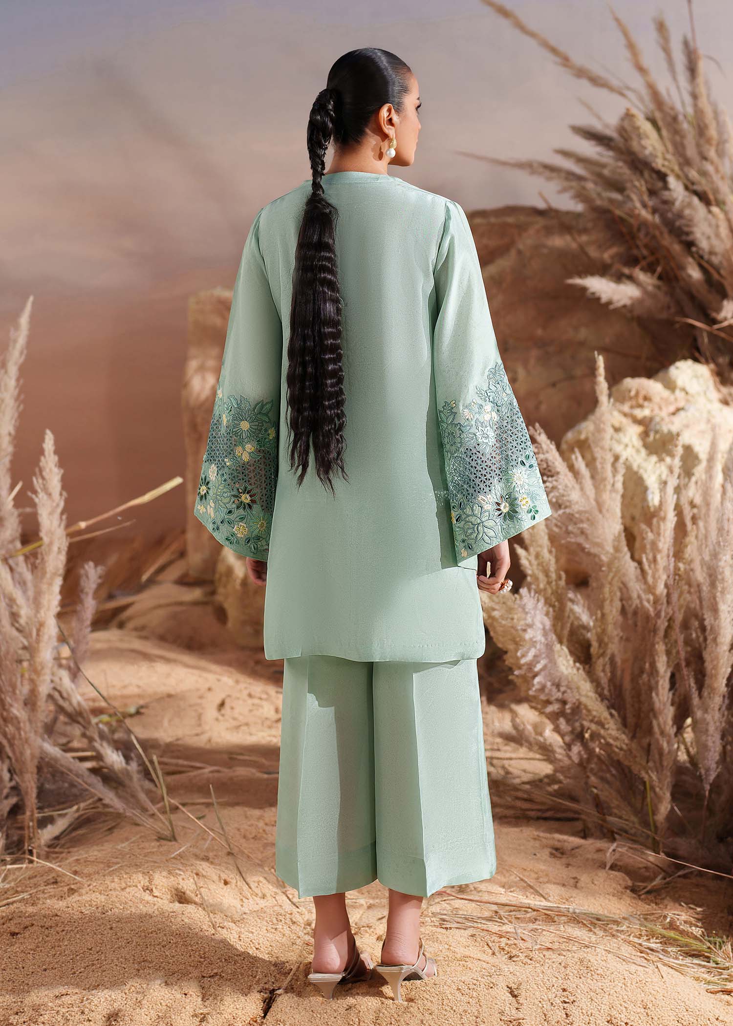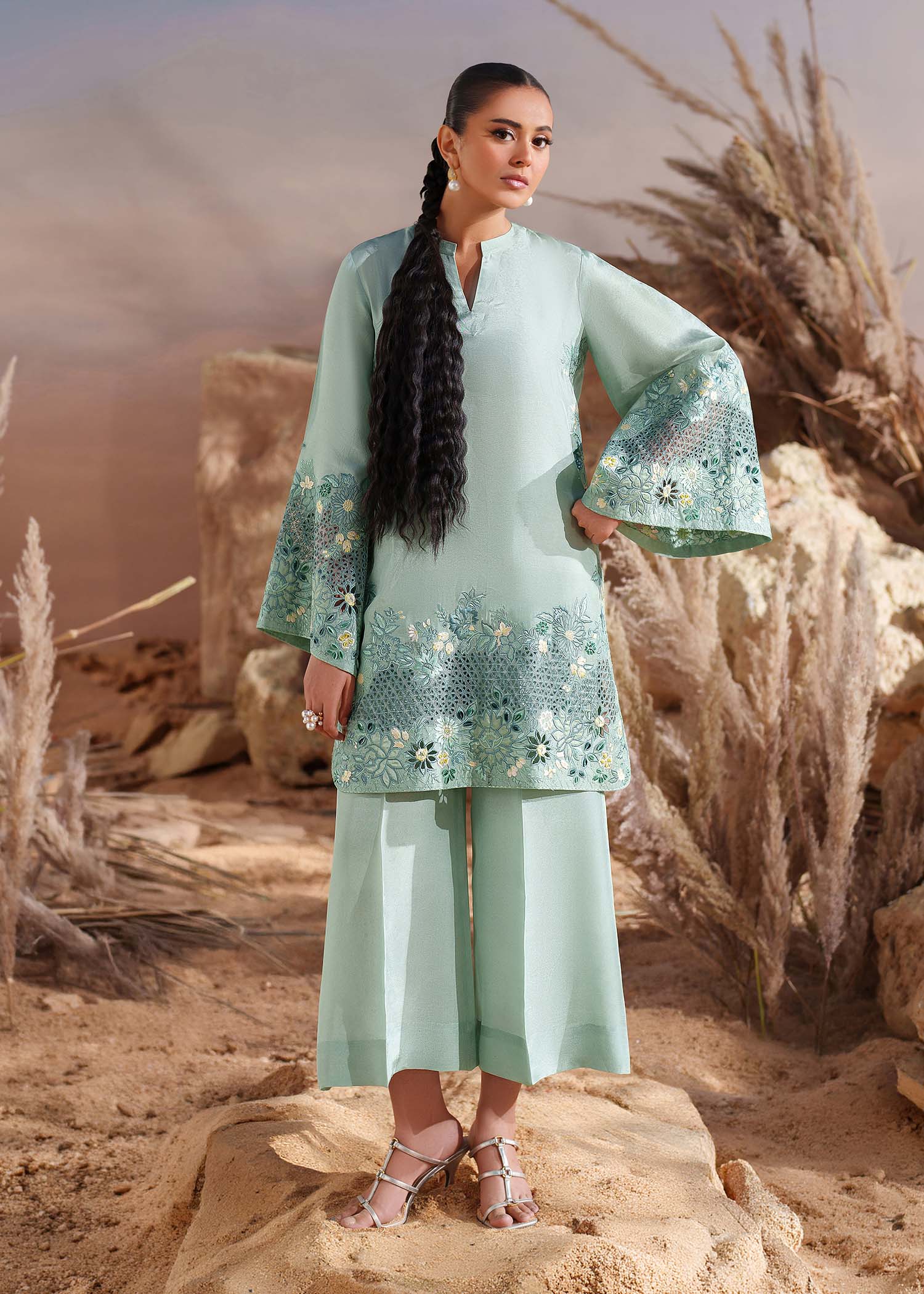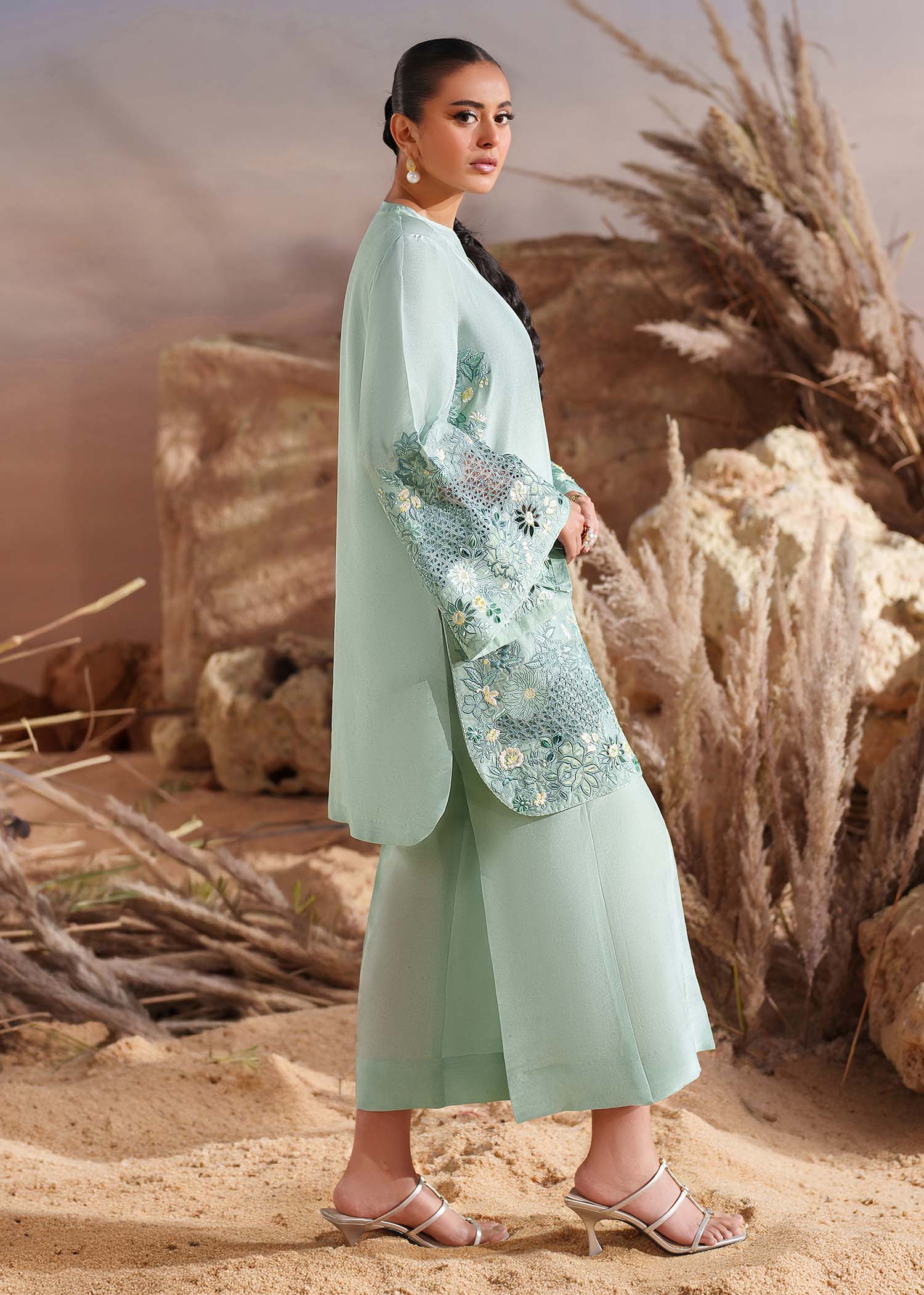 In Misty mint & Turquoise, this tussel silk shirt is cut in a relaxed silhouette, its surface traced with floral embroidery embroidery that elevate the front and sleeves with delicate artistry. The main highlight is the floral motifs that are appliqued on the shirt. Paired with straight pants and delicate 3D tassels, the ensemble carries the grace of sheer craft with effortless charm.